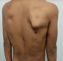 Marcas de queimaduras de cigarro e escápula quebrada.